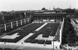 Politische Feier-Kultur. Von einem Institutsmitarbeiter angefertigte Fotografie vom Institutssitz im Berliner Stadtschloss auf den Lustgarten anlässlich des Einzugs der Spanischen „Legion Condor“ 1938 [11]