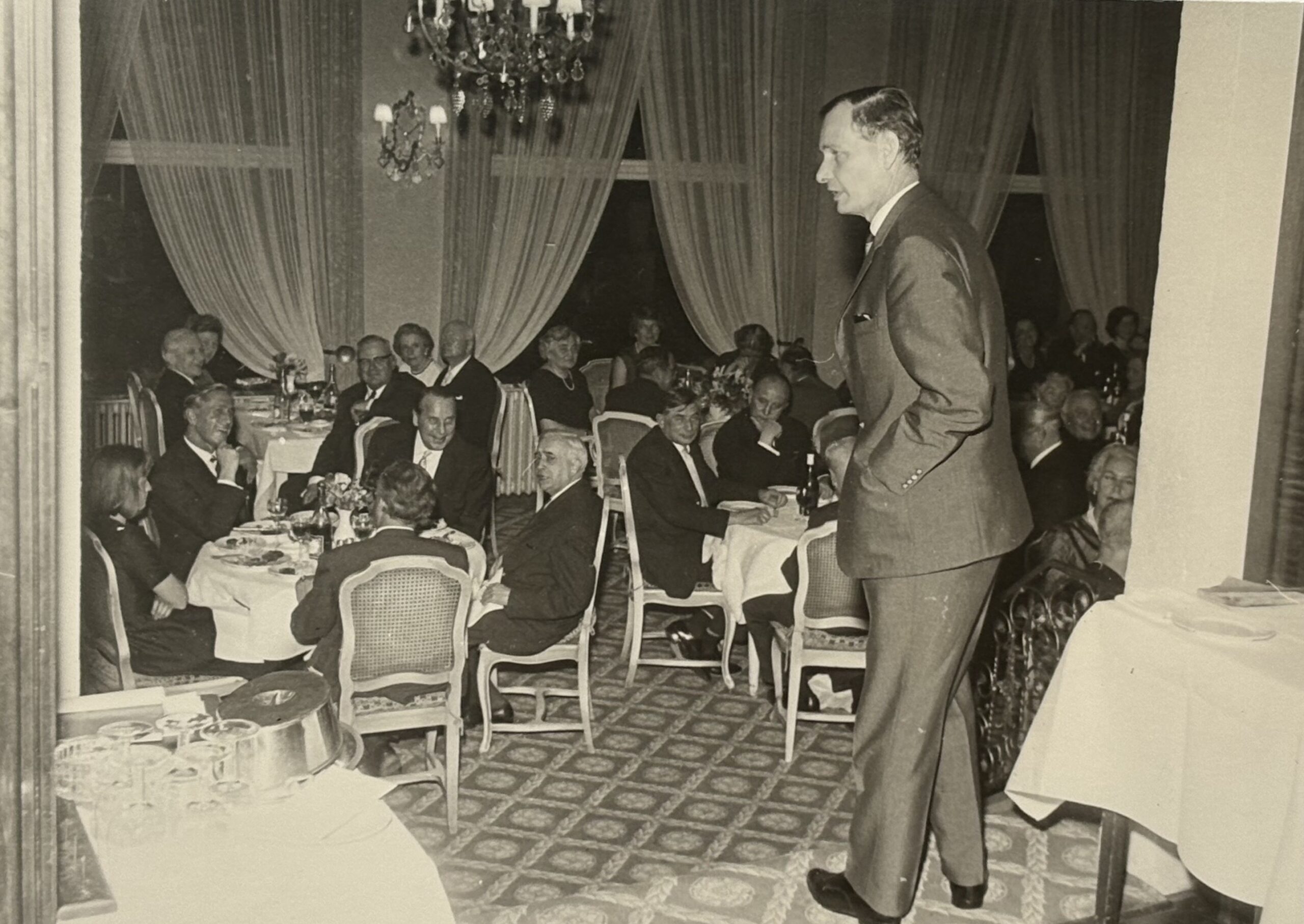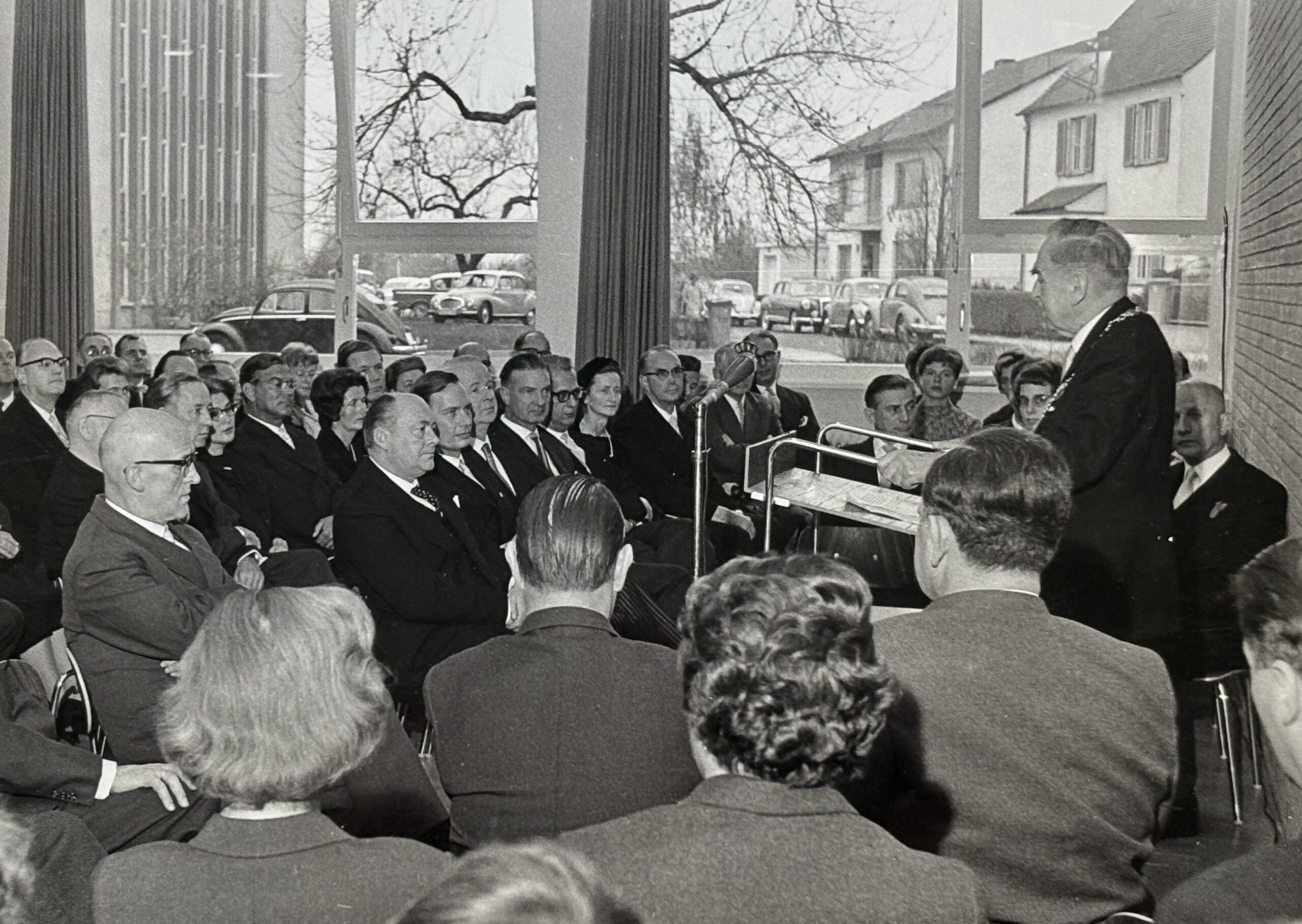 Gefeiert wurde im neuen Vortragssaal mit 123 Gästen, mit Ansprachen von MPG-Präsident Otto Hahn und Institutsdirektor Mosler. Hermann Mosler „beschwor“ in seiner Ansprache zwar weder eine gemeinsame, die Feiergesellschaft verbindende Geschichte jenseits der „schon seit über 30 Jahren“ bestehenden „Denk- und Arbeitsweise und einer gemeinsamen Gesinnung“ („Sie finden hier den alten Stil“), noch traf er grundlegende Aussagen über die Rolle des Instituts, jenseits des Umstandes, dass „das Völkerrecht mit seiner erweiterten Entwicklung zu den internationalen, supranationalen Organisationen, also ganz neue Dinge, zu bewältigen“ habe.[27] Dennoch gehen von seiner Rede ein merklicher Optimismus und ein gemeinschafstiftender Geist aus, die aus dem Umstand resultierten, dass das Institut und seine Angehörigen nach vielen entbehrungsreichen Jahren eine angemessene Heimstätte hatten – mit einem großen Veranstaltungssaal, der Feiern und größere Fach-Veranstaltungen überhaupt erst möglich machte. Der wissenschaftliche Festvortrag, gehalten von Alumnus Hans-Joachim von Merkatz zum Thema „Das Ringen um die Verwirklichung der politischen Gemeinschaft Europas“ wies in die von Mosler verkörperte Stoßrichtung des Instituts, die in den folgenden Jahren in einer stetig steigenden Zahl internationaler Vortragsgäste sowie in den ab 1959 vom Institut und der „Heidelberger Gesellschaft“ ausgerichteten verfassungsvergleichenden internationalen Kolloquien ihre Fortsetzung fand.[28]