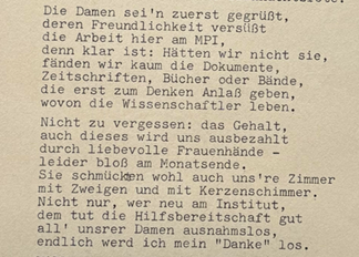 [83] Diese Praxis ist auch aus anderen Instituten überliefert: Birgit Kolboske, Hierarchien. Das Unbehagen der Geschlechter mit dem Harnack-Prinzip. Frauen in der Max-Planck-Gesellschaft, Studien zur Geschichte der Max-Planck-Gesellschaft Bd. 7, Göttingen: Vandenhoek & Rupprecht 2023, 100.