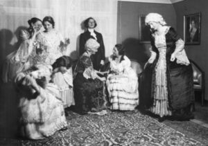 Der „avantgardistische“ Humor einiger Institutsangehöriger, wie auch das illustre soziale Umfeld des Instituts, wird unter anderem bei der Feier von Viktor und Marie Bruns‘ 50. Geburtstag im Februar 1935 deutlich, der nur wenige Wochen nach dem Jubiläum gefeiert wurde. Abermals gab es eine Rokoko-Kostüm-Aufführung, Marie Bruns gab auf dem Klavier eine „Mozartbegleitung mit recht dürftigen Trillern“ und Direktionssekretärin Ellinor Greinert trug, als Tübinger Stiftskirche verkleidet (Viktor Bruns‘ Familie stammte aus Tübingen), Gedichte vor. Das Kostüm war, in Anlehnung an Hugo Ball, von einem Freund der Familie, dem Künstler Hans Sauerbruch, einem Sohn des Chirurgen Ferdinand Sauerbruch, angefertigt worden.[59] Nicht weniger exklusiv macht die Bruns’sche Festkultur, dass die überlieferten Bilder von der seinerzeit sehr gefragten Porträtphotographin Lore Feininger, der Ex-Frau Lyonel Feiningers, angefertigt worden waren.[60]